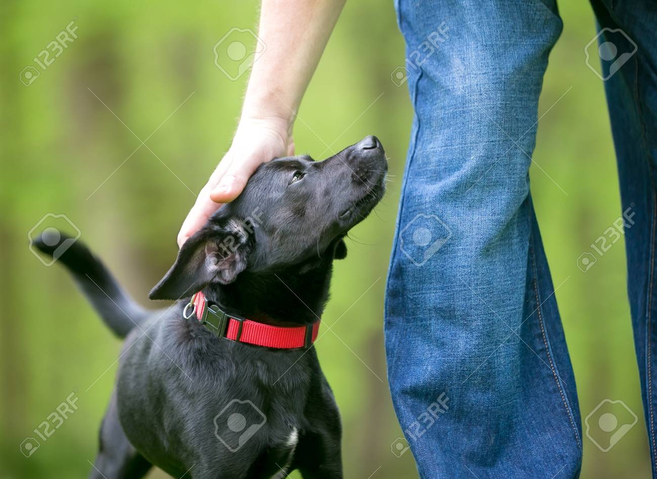 A Person Petting A Small Black Terrier Mixed Breed Dog Outdoors